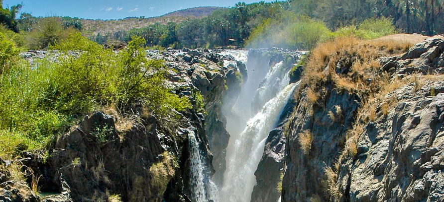 Hinter Grootfontein passierst du die »Rote Linie«, einen Veterinärzaun, der quer durch Namibia verläuft. Hier ändert sich das Landschaftsbild schlagartig von der für Namibia typischen unbewohnten Weite zu einem dichter besiedelten Gebiet mit vielen kleinen Dörfern sowie hohen Bäumen und Palmen. Auf der Weiterfahrt kommst du an Rundu vorbei. Die zweitgrößte Stadt des Landes liegt am mächtigen Okavango, der eine natürliche Grenze zu Angola bildet. Kurze Zeit später schipperst du auch schon auf dem selbigen und machst mit der artenreichen Vogelwelt der Flusslandschaft Bekanntschaft. Hierzu zählen Fischreiher, Rosenpapagei; und eine Besonderheit ist der kleine Scharlachspint. An den Stromschnellen der Popafälle lauschst du den Geräuschen des Okavango-Flusses. Keine Sorge – Du bleibst garantiert trocken, denn die Fälle haben eine Fallhöhe von maximal vier Metern. Wer möchte, läuft barfuß durch den weißen Sand, das quietscht so schön.
